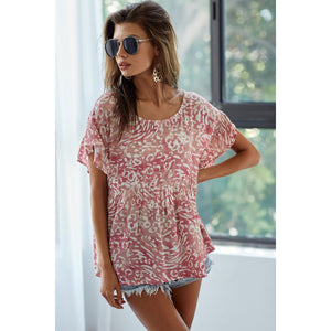 The Leopard Print Gauze Woven Flutter Sleeve Blouse showcases a trendy leopard print design on lightweight and breathable gauze fabric. The flutter sleeves add a feminine and playful touch to the blouse, perfect for adding some flair to your outfit. This versatile blouse can be dressed up or down, making it a stylish choice for various occasions.