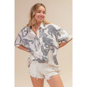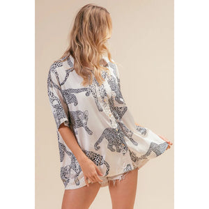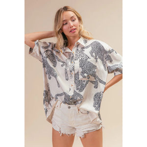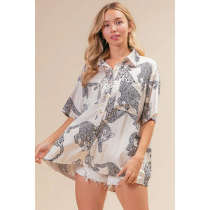 This silky satin shirt top features a bold and stylish leopard print design for a chic and trendy look. The short sleeves add a casual and breezy feel to the top. Perfect for adding a touch of sophistication and glamour to your outfit, this top can be dressed up with tailored pants or dressed down with jeans for a versatile and fashion-forward ensemble.