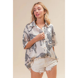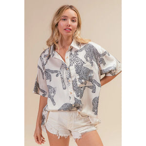 BiBi Leopard Print Short Sleeve Silky Satin Shirt Top