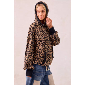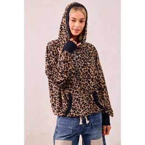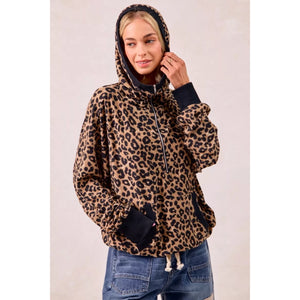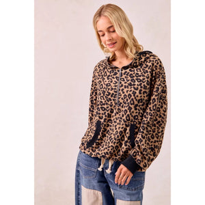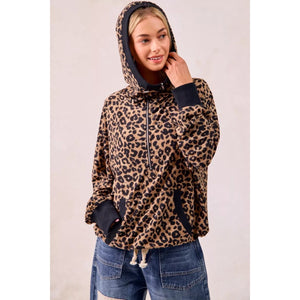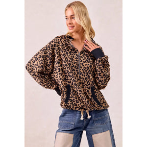 BiBi Leopard Print Waffle Half Zip Up Hoodie W Pocket