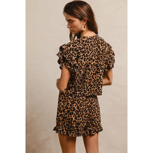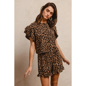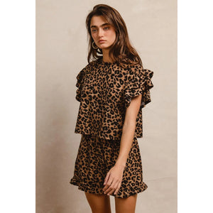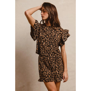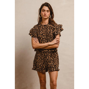 BiBi Leopard Print Waffle Texture Layered Ruffle Sleeve Top and Shorts Set