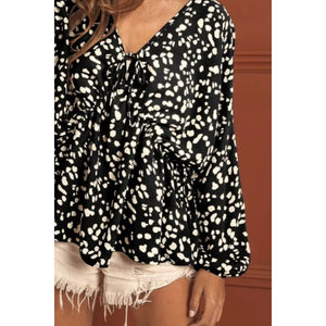 This V-neck long-sleeve top features a stylish leopard print design with tied spaghetti straps for a trendy look. The woven fabric adds a touch of sophistication to the overall style. Perfect for adding a touch of animal print to your outfit, this top can be easily dressed up with pants or skirts for a chic ensemble.