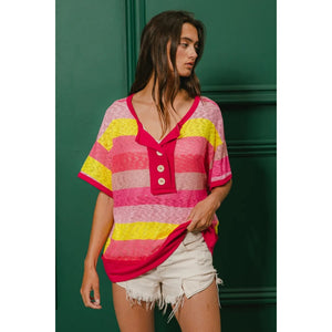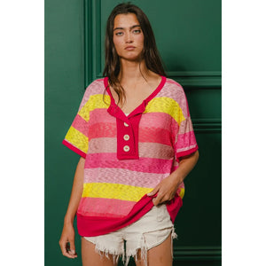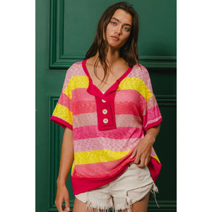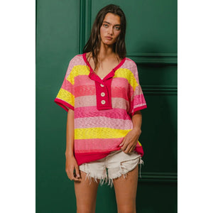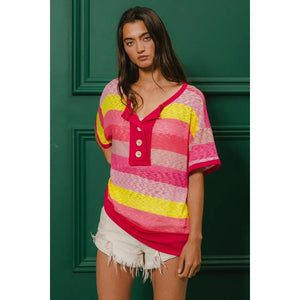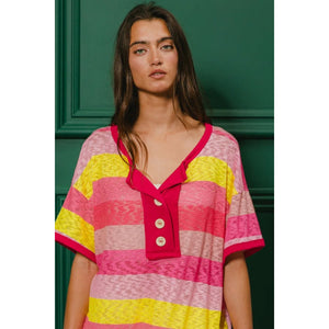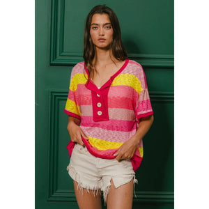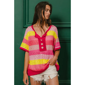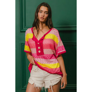 BiBi Multi Color Stripe Hacci Button Detail Ringer Top