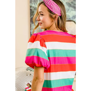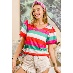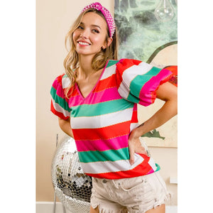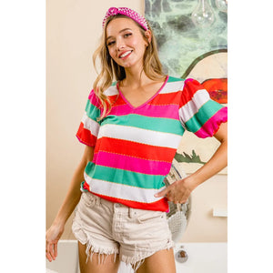 BiBi Multi Stripe Color Print Puff Sleeves V Neck Top