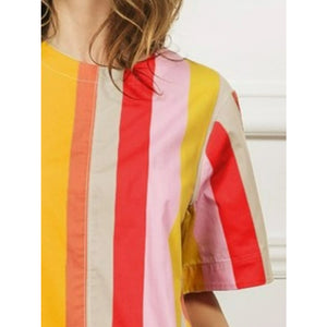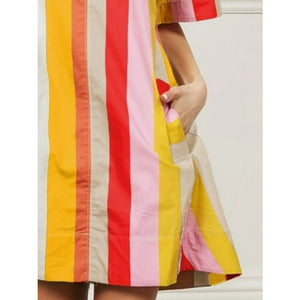 This eye-catching tee dress features a stunning rainbow striped pattern with vibrant colors including red, orange, yellow, pink, and white vertical stripes. Made from comfortable cotton blend fabric, it offers a relaxed fit with short sleeves and a classic round neckline. The dress includes practical side pockets and falls to above-knee length, making it perfect for casual summer outings. The pull-on style ensures easy wear while the colorful design adds a playful and fashion touch to any wardrobe. Ideal for those who love bold patterns and comfortable everyday wear.