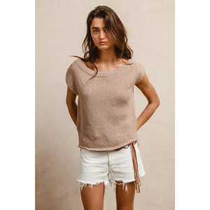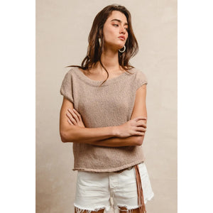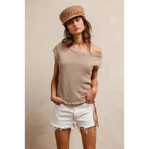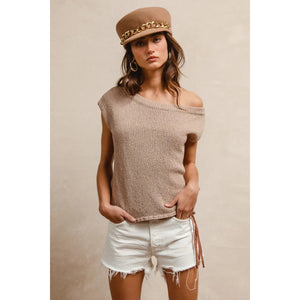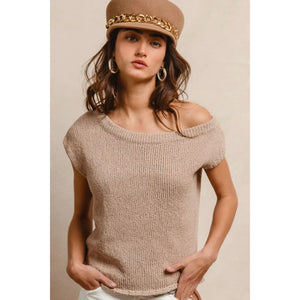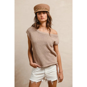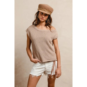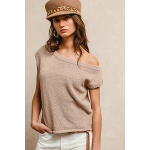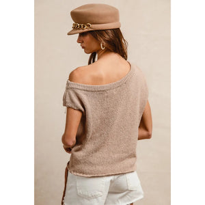 This stylish off-shoulder pullover features a relaxed knit construction in a sophisticated taupe shade. Made from soft, breathable knit material that offers comfort and flexibility. The distinctive off-shoulder neckline creates an effortlessly chic look while the short sleeves provide versatility for layering. The loose, comfortable fit flatters various body types and the neutral color palette makes it easy to pair with different bottoms. Perfect for casual outings, weekend wear, or creating relaxed yet polished everyday looks. The textured knit fabric adds depth and visual appeal while maintaining the garment's lightweight feel.