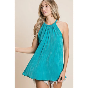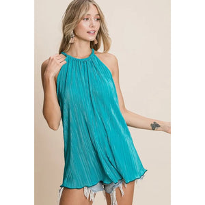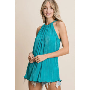 The Pleating Knit Halter Neck Top is a sophisticated and stylish piece that features pleating details and a halter neckline. The pleating adds texture and visual interest to the knit fabric, creating a more dynamic and elegant look. The halter neckline is flattering and adds a touch of chicness to the top. This top is versatile and can be dressed up or down for different occasions. Pair it with tailored pants or a skirt for a polished and dressy outfit, or with jeans for a more casual yet fashionable look. The combination of pleating, knit fabric, and halter neckline makes this top a refined and stylish addition to any wardrobe.