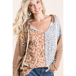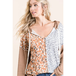 Stay cozy and stylish in this Popcorn Waffle Knit Hoodie featuring a Print Block Front. The popcorn waffle knit texture provides a unique and cozy feel, perfect for chilly days. The print block front adds a fun and eye-catching element to the hoodie, making it a versatile and trendy piece. Pair this hoodie with your favorite jeans or leggings for a casual and fashionable look. Embrace comfort and style with this must-have addition to your wardrobe.