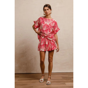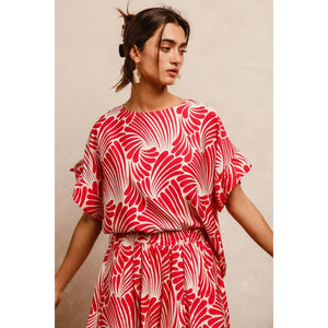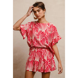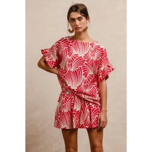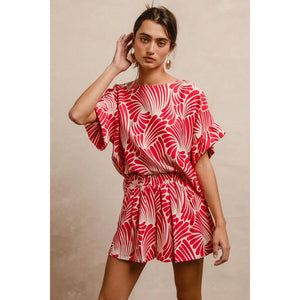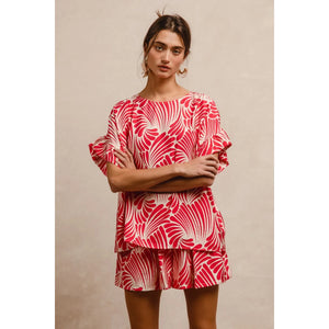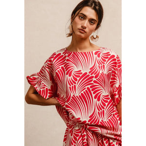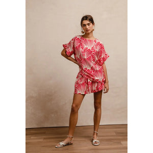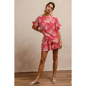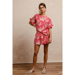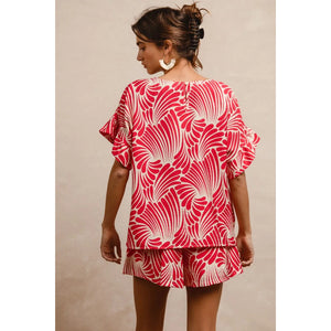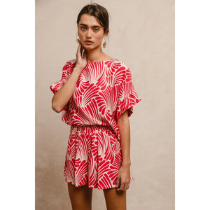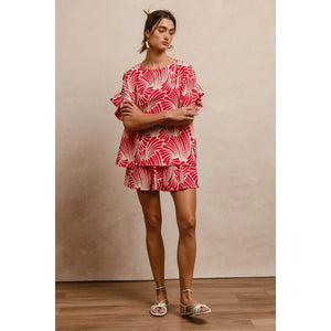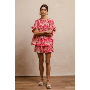 This stunning tropical palm print blouse features eye-catching red and white botanical patterns that bring vacation vibes to your wardrobe. Crafted from lightweight, breathable fabric perfect for warm weather, it showcases charming ruffle sleeves that add feminine flair. The adjustable tie waist belt creates a flattering silhouette while maintaining comfort. The relaxed fit makes it ideal for all-day wear, transitioning effortlessly from casual daytime activities to evening gatherings. The bold palm leaf motif adds a fashion tropical touch, making this piece a standout addition to any fashion-forward wardrobe.