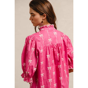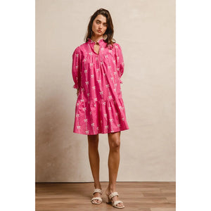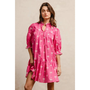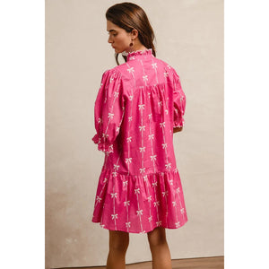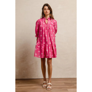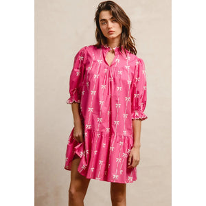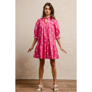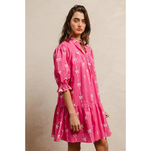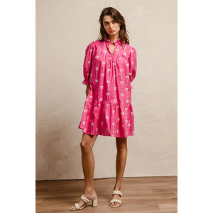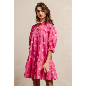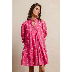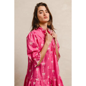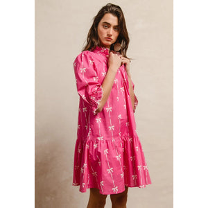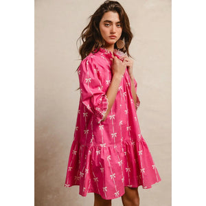 This stunning pink bohemian mini dress features a vibrant tropical palm print that captures the essence of summer style. Crafted from lightweight, breathable fabric, it offers exceptional comfort and movement. The dress showcases three-quarter puffy sleeves with elastic cuffs, creating a romantic silhouette that flatters all body types. The high neckline with decorative tie detail adds sophistication while the loose-fitting design ensures comfortable all-day wear. Perfect for beach vacations, casual outings, or summer parties, this versatile piece combines bohemian charm with contemporary fashion. The elastic waistband provides a flattering fit while the above-knee length keeps the look fresh and youthful.