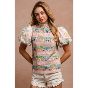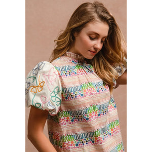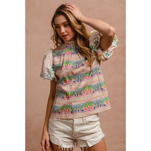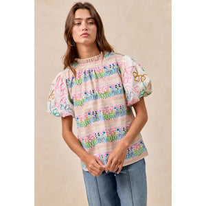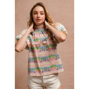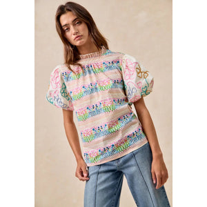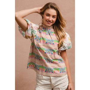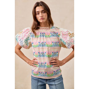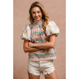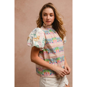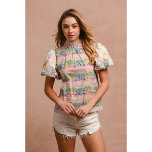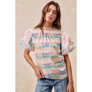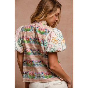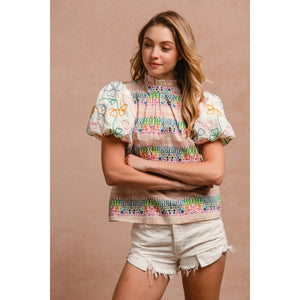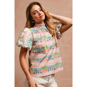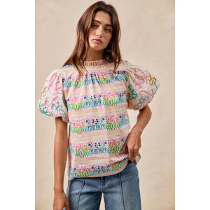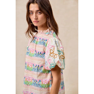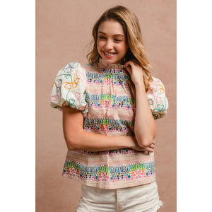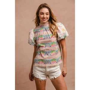 This stunning bohemian blouse features delicate floral embroidery in vibrant pink, green, and blue hues across horizontal striped bands. The romantic puff sleeves and smocked high neckline create a vintage-inspired silhouette, while the lightweight, breathable fabric ensures comfort in warm weather. Perfect for festival season or summer outings, this versatile top pairs beautifully with denim shorts or flowing skirts. The intricate embroidered details and feminine design make it an eye-catching statement piece for any wardrobe.