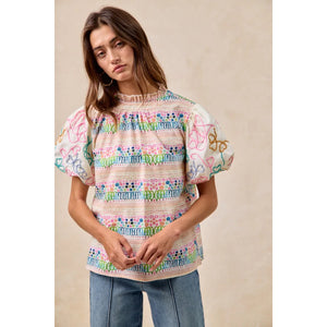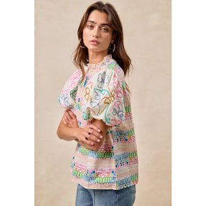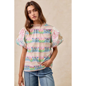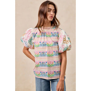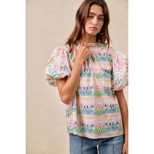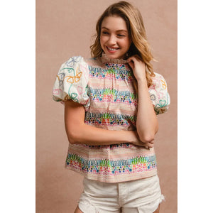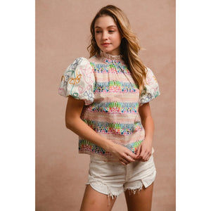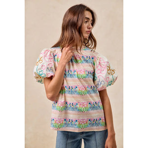 BiBi Ruffle Neckline Blouse With Embroidery Bubble Sleeve