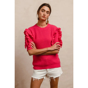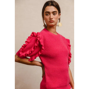 This charming pullover sweater features an eye-catching ruffle detail along the shoulders and sleeves, crafted from a comfortable ribbed knit fabric. The light blue color creates a fresh, feminine look perfect for any season. The design combines classic sweater comfort with modern romantic details. The ribbed texture provides a flattering fit while the ruffled accents add a sophisticated touch. Ideal for pairing with casual or dressy bottoms, this versatile piece works well for both everyday wear and special occasions.