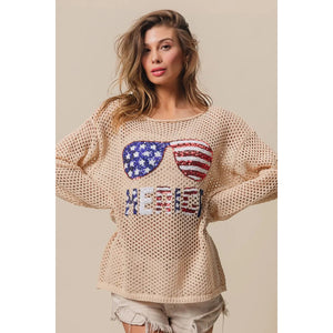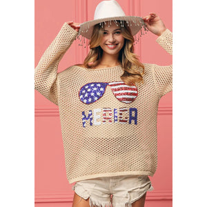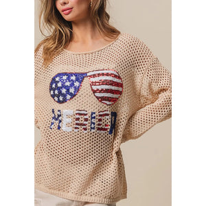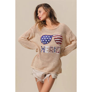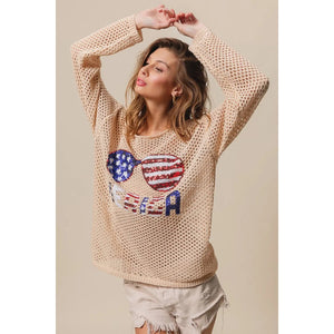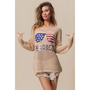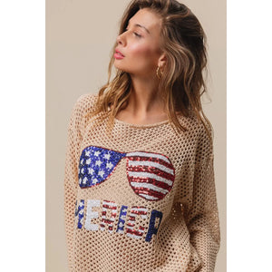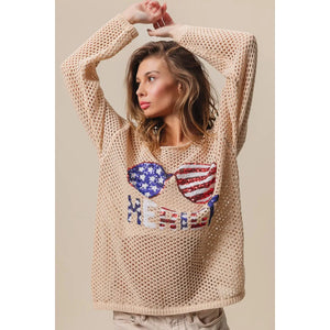 The Sequin American Flag Sunglasses Knit Cover Up is a unique and festive piece that combines sequins, American flag design, sunglasses, and a knit cover-up. This eye-catching garment is perfect for adding a touch of fun and patriotism to your beach or poolside look. The sequin detailing adds a playful shimmer to the American flag motif, while the knit cover-up provides a lightweight and stylish layer for sunny days. Pair it with your favorite swimsuit and sandals for a statement-making ensemble that embodies a playful, summer vibe.