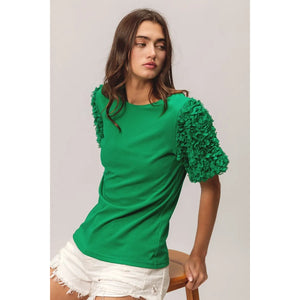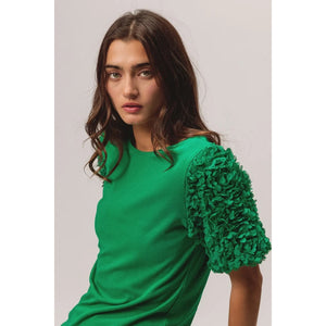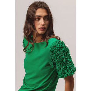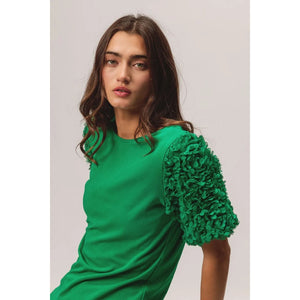 This knit top features short mesh flower sleeves, adding a feminine and elegant touch to the design. The mesh flower detailing creates a stylish and eye-catching look. Made with comfortable knit fabric, this top is perfect for a chic and versatile outfit. Elevate your wardrobe with this trendy short mesh flower sleeve knit top!