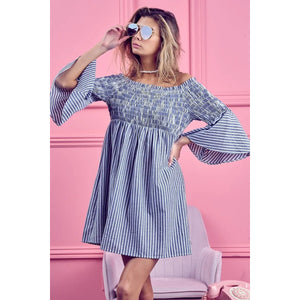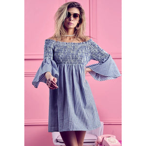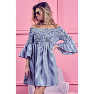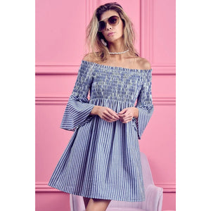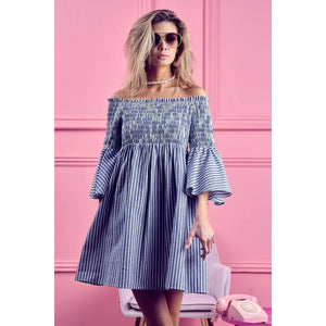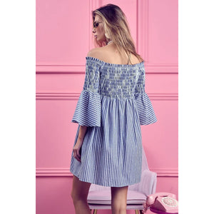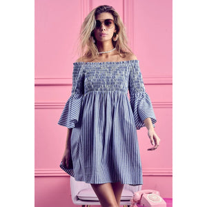 The Smocked Off-Shoulder Striped Dress is a charming and feminine piece featuring a flattering off-shoulder neckline and a sweet striped design. The smocked detailing offers a fitted and comfortable silhouette that complements the playful and summery vibe of the dress. Perfect for showcasing your shoulders and creating a breezy and stylish look for warm weather outings or casual occasions.
