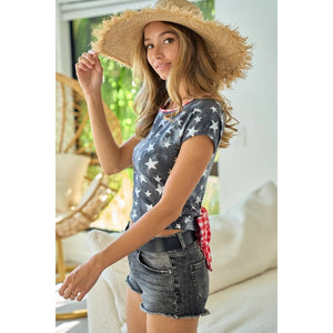 This top features a star print knit front with a unique back cut out design and plaid tied detail for a trendy and edgy look. The star print adds a fun and playful element to the top, while the back cut out and plaid tied feature create a bold and statement-making style. Made with high-quality fabric, this top offers both comfort and fashion-forward flair. Elevate your outfit with this chic and versatile top that effortlessly combines different patterns and details for a standout look.