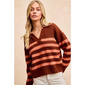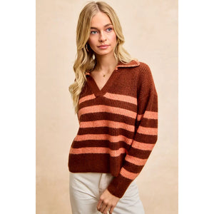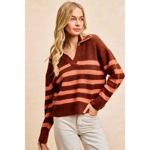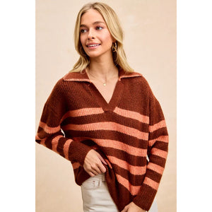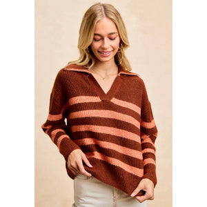 BiBi Striped Sweater Top with Collar Stitched Details