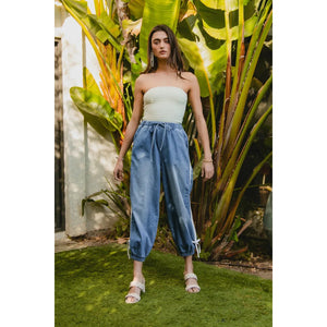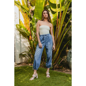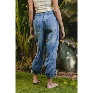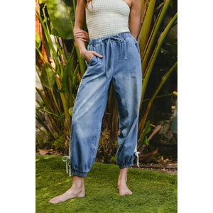 These stylish drawstring jogger jeans combine the classic appeal of denim with modern comfort features. Crafted from soft-washed cotton denim blend, they feature an elastic waistband with adjustable drawstring for perfect fit, relaxed silhouette through the body, and tapered legs with elastic cuffs. The light blue wash offers versatility for casual occasions, while functional side pockets add practicality. Perfect for lounging, running errands, or casual outings, these jeans deliver all-day comfort without compromising on style.