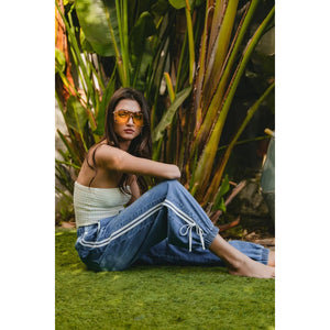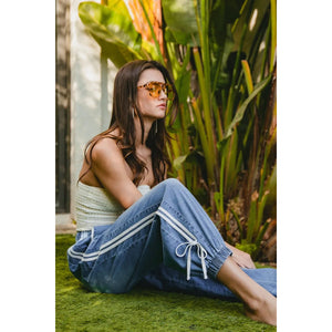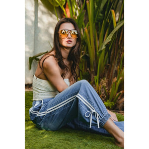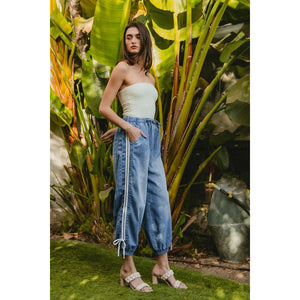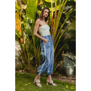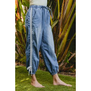 BiBi Striped Tape Details With Bot Tied Point Elastic Waist Jeans