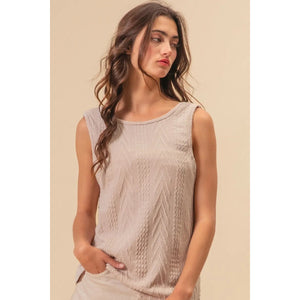 This sleeveless top features a textured sweater knit design with a twist back detail, adding a touch of sophistication and style to your outfit. The textured knit adds depth and visual interest to the top, while the twist back design creates a unique and eye-catching element. The sleeveless silhouette makes this top perfect for layering or wearing alone during transitional seasons. Made with high-quality materials, this top offers both comfort and a fashion-forward look. Elevate your wardrobe with this chic and versatile top that effortlessly combines texture and a twist back detail for a modern and stylish ensemble.