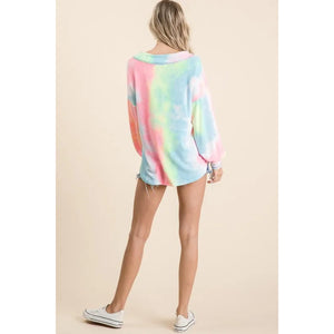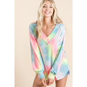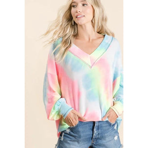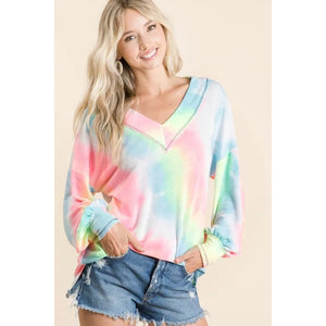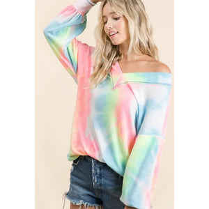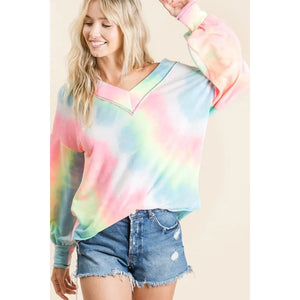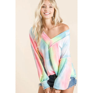 BiBi Tie Dye French Terry V-Neck Top with Puff Sleeves