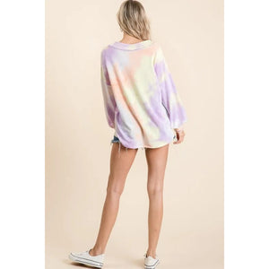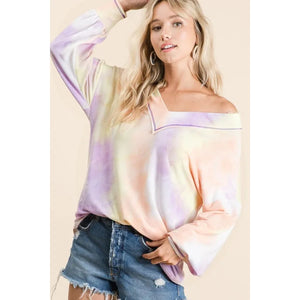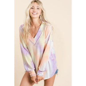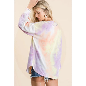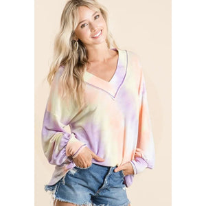 BiBi Tie Dye French Terry V-Neck Top with Puff Sleeves