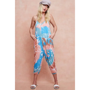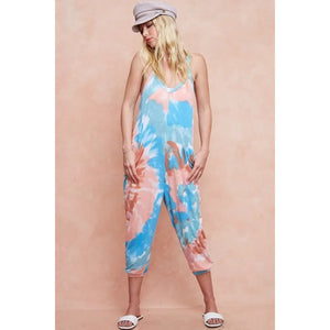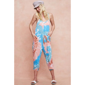 A tie-dye knit mid-length casual jumpsuit is a stylish and comfortable one-piece garment that combines the fun and vibrant tie-dye pattern with a cozy knit fabric. The mid-length design offers a versatile and relaxed fit, making it suitable for various body types and occasions. The tie-dye print adds a playful and bohemian touch to the jumpsuit, creating a bold and eye-catching look. The knit fabric provides softness and stretch, ensuring comfort and ease of movement. This casual jumpsuit is perfect for laid-back and everyday wear, offering a fashionable and effortless outfit option. Pair it with sneakers or sandals for a relaxed look, or dress it up with heels and accessories for a more stylish ensemble. Overall, a tie-dye knit mid-length casual jumpsuit is a trendy and comfortable choice for a chic and easy-to-style outfit.