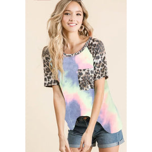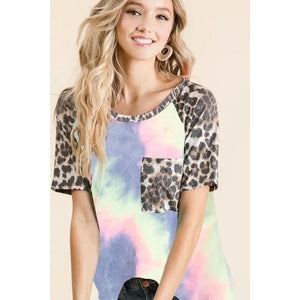 BiBi Tie Dye Knit Top with Leopard Raglan Sleeves
