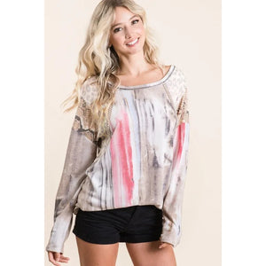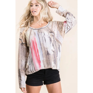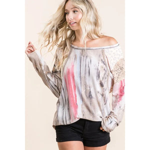 BiBi Tie Dye Knit Top with Print Block Shoulder
