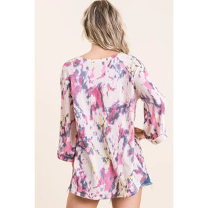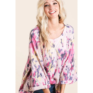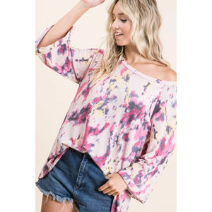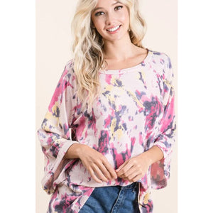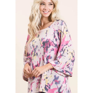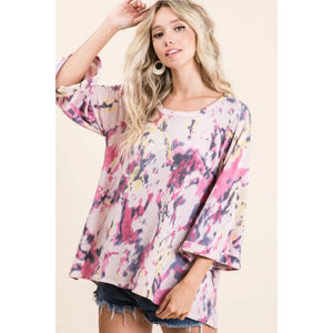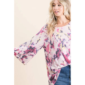 BiBi Tie Dye Print Terry A Line Top with Bell Sleeves
