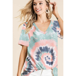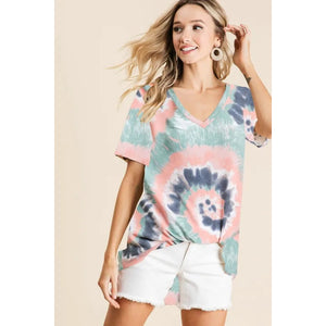 BiBi Tie Dye Print Terry V Neck Short Sleeve Top