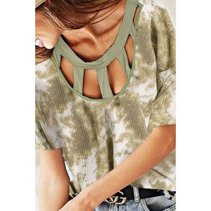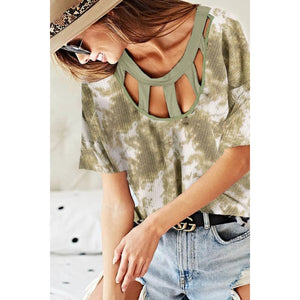 BiBi Tie Dye Print Waffle Top with Contrast Caged Neck