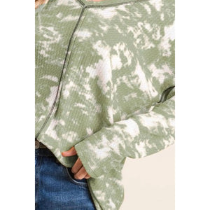 This tie-dye print waffle V-neck top with contrast detailing is a trendy and eye-catching piece for your casual outfits. The tie-dye print adds a fun and playful element to the top. The waffle texture provides a cozy and laid-back feel, perfect for everyday wear. The contrasting details add a modern and stylish touch to the design. Stay fashionable and comfortable in this chic tie-dye print waffle V-neck top with contrast accents.