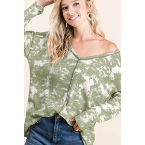 BiBi Tie Dye Print Waffle V Neck Top with Contrast