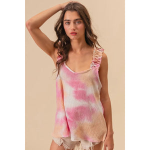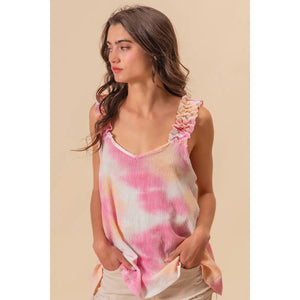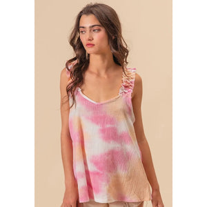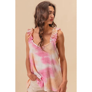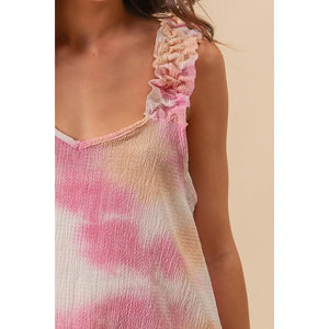 This textured woven top features a trendy tie-dye print and charming ruffled details for a bohemian-inspired look. The tie-dye print adds a fun and unique touch to the top, making it a stylish statement piece. With delicate ruffled accents, this top exudes a feminine and playful vibe that is perfect for a casual yet trendy outfit. Made with high-quality textured fabric, it offers both style and comfort for all-day wear. Elevate your wardrobe with this chic and fashionable top that effortlessly combines texture, print, and a touch of whimsy.