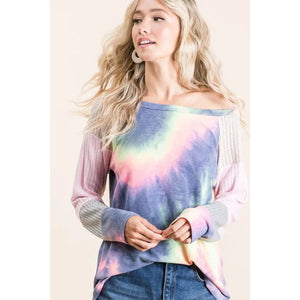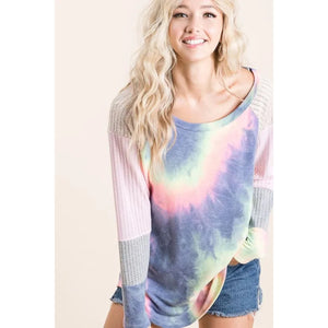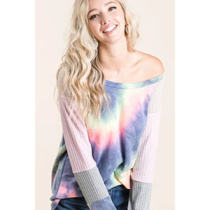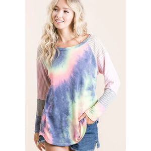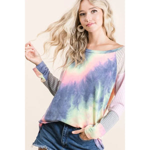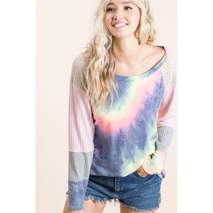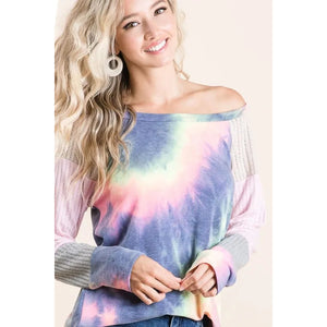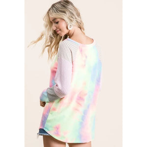 BiBi Tie Dye Terry Top With Color Block Pointelle Knit
