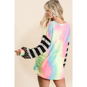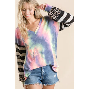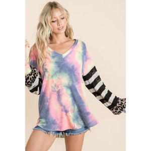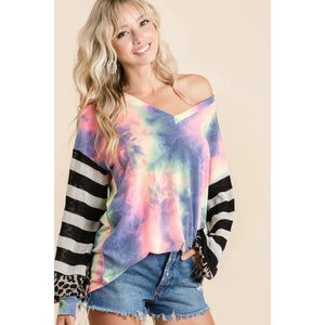 BiBi Tie Dye V Neck Top with Stripe Puff Sleeves