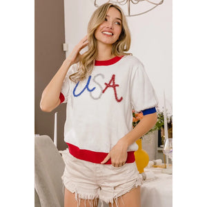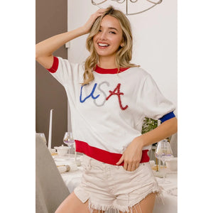 The USA Metallic Letter Color Block Knit Top combines metallic letter detailing with a stylish color block design. This top is perfect for adding a touch of sparkle and a trendy look to your outfit. The knit material ensures comfort and versatility for styling.