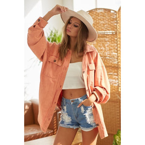 The Washed Button Up Shacket with Chest Pockets is a versatile and stylish piece that combines the features of a shirt and a jacket. The washed finish gives it a relaxed and lived-in look. The button-up front adds a classic touch, allowing for easy layering. The chest pockets provide a functional and fashionable detail. This shacket is perfect for adding a casual and trendy vibe to your outfit, whether worn as a lightweight jacket or a top layer.