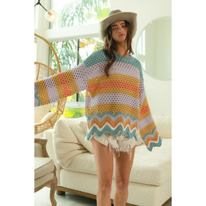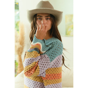 BiBi Wavy Hem Openwork Contrast Round Neck Sweater