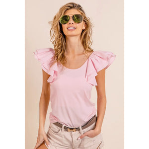 BiBi Wide Layered Ruffle Sleeve Scoop Neck Ribbed Top