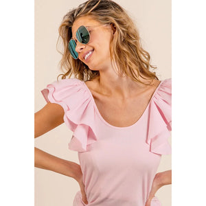 This stylish pink T-shirt features charming ruffle cap sleeves that add a feminine touch to your casual wardrobe. Made from soft, breathable cotton blend fabric, it offers all-day comfort with its form-fitting silhouette. The flattering scoop neckline and fashion pink hue make it perfect for casual outings, date nights, or everyday wear. The lightweight material ensures easy movement while the ruffle detailing adds a playful, romantic element. Pair with jeans, shorts, or skirts for versatile styling options. Machine washable for easy care.