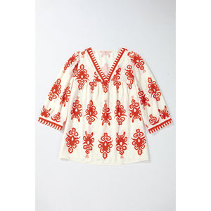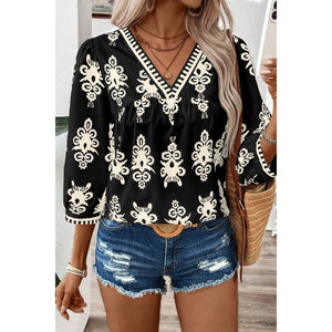 Black Vintage Geometric Printed 3/4 Sleeve V Neck Blouse