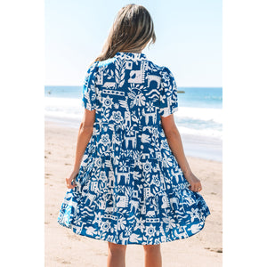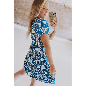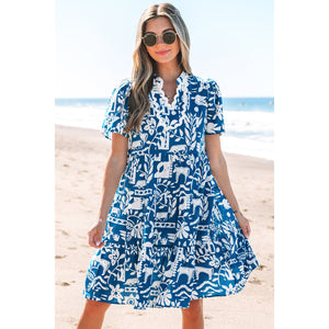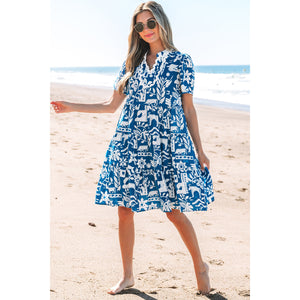 Blue Ricrac Trim Split Neck Floral Loose Dress