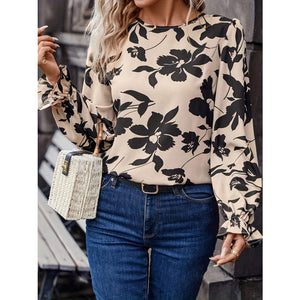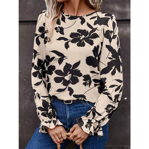 Bow Back Printed Round Neck Flounce Sleeve Blouse
