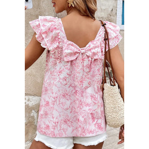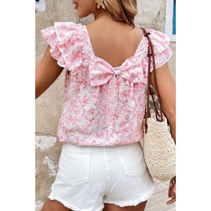 Bow Back Printed Ruffled Cap Sleeve Blouse