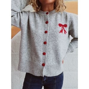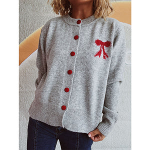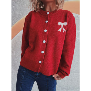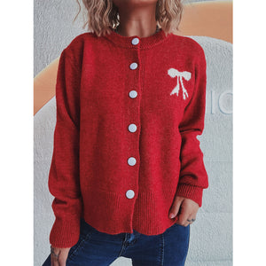 Bow Round Neck Button Up Long Sleeve Cardigan