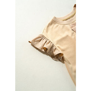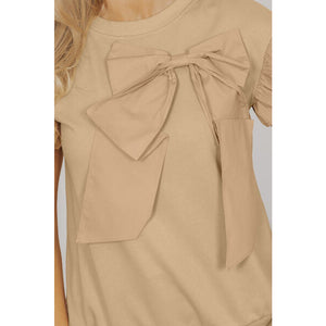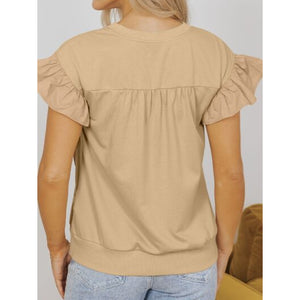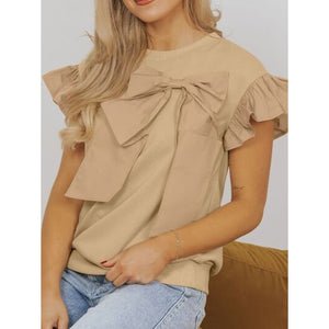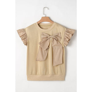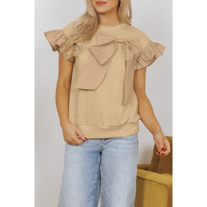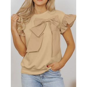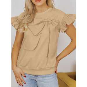 Bow Ruffled Round Neck Cap Sleeve Blouse