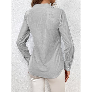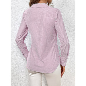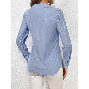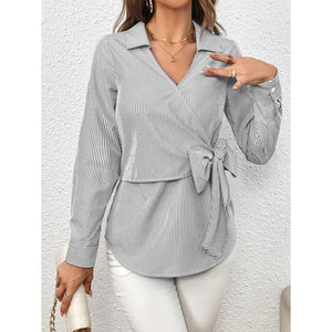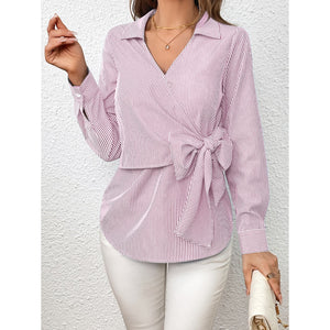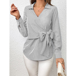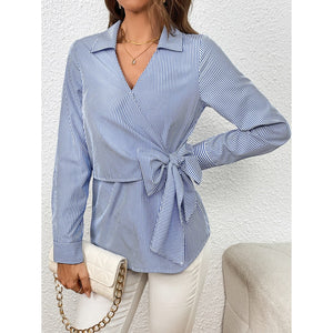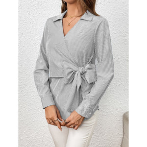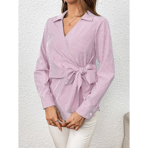 Bow Tie Waist Johnny Collar Neck Striped Blouse